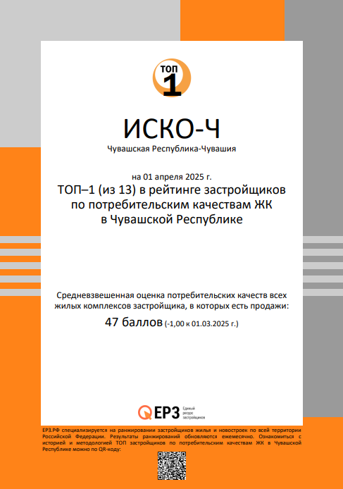 По данным портала ЕРЗ.РФ на 01.04.2025 г. компания «ИСКО-Ч» занимает 1 место в ТОП застройщиков Чувашской Республики по потребительским качествам жилых комплексов.